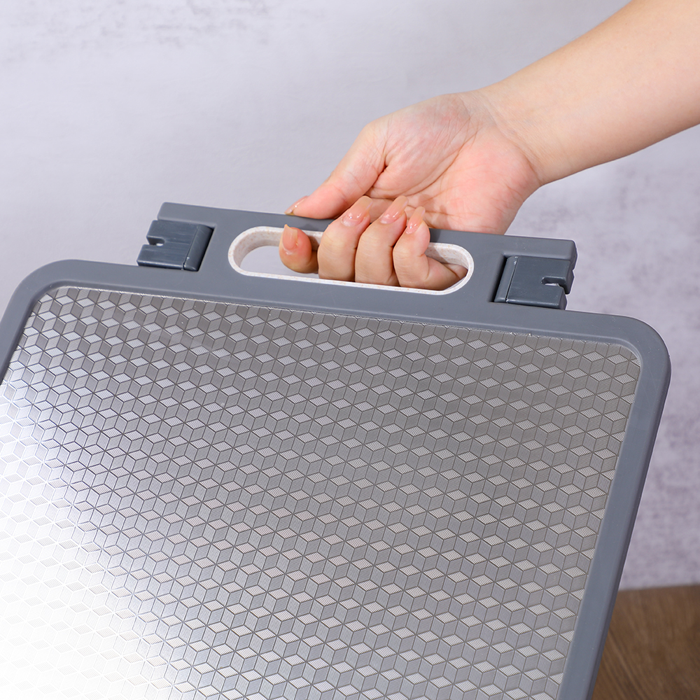 防刮网状设计不锈钢双面切菜板是一款多功能厨房必备品,将两个功能表面结合在一个耐用的工具中。一侧具有凸起的网状图案,可安全、方便地切割刀片,而反面则具有光滑的不锈钢表面,可用于擀面团、盛放奶酪或展示食物。这款双面板由优质 304 不锈钢制成,可防刮擦、防细菌和防异味,网状一侧有一个集成的果汁槽,可收集液体,防滑底座可确保稳定性。它非常适合厨房中的多任务处理,无需使用多个厨房板,节省空间,同时为不同的食物准备任务提供卫生解决方案。
