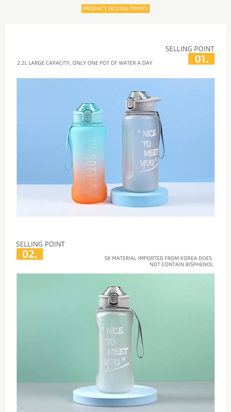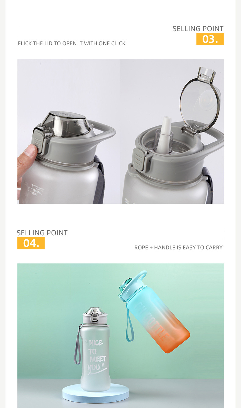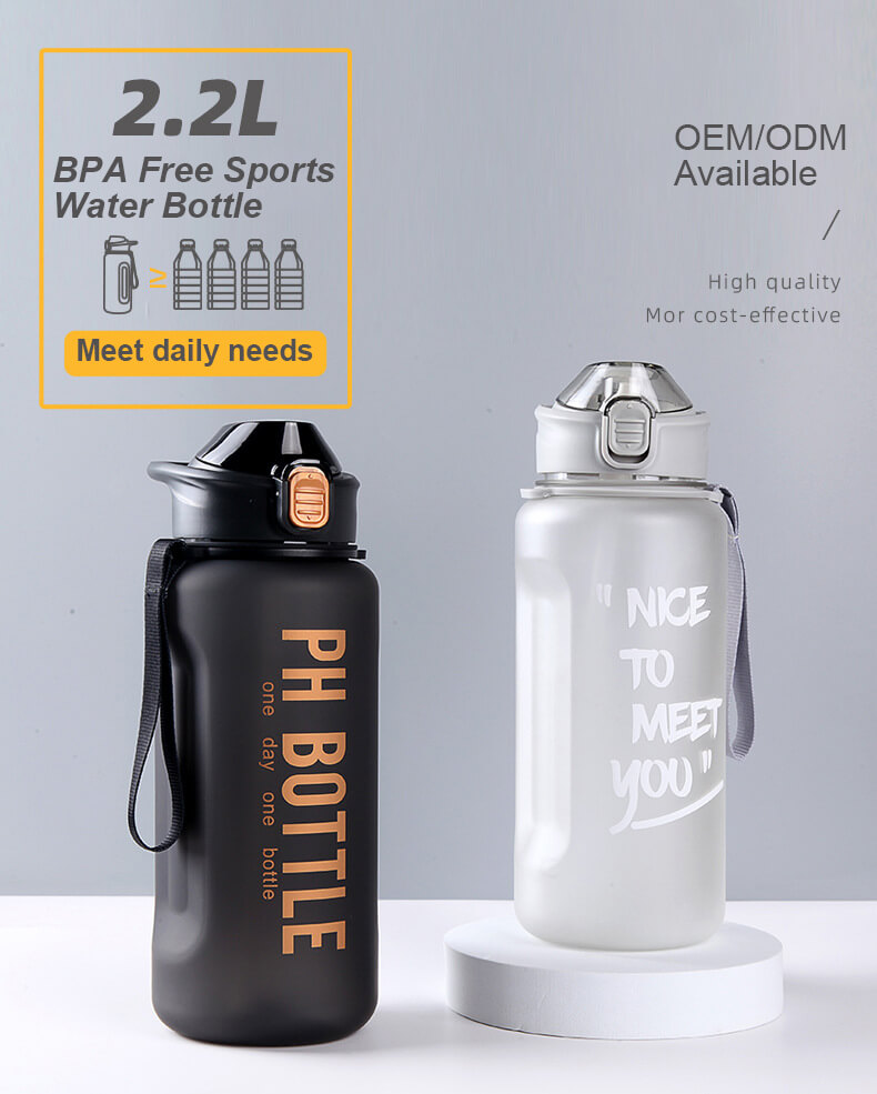 答:虽然 2.2 升容量很大,但该瓶子还配有背带和手柄,方便运输。该设计的重点是减少补充频率,同时保持便携性。