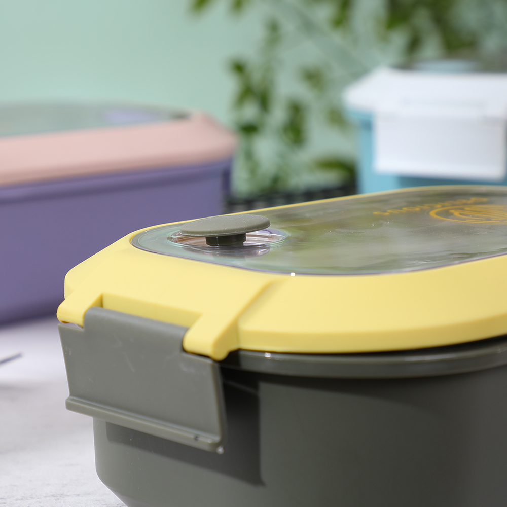 该午餐盒配有不含 BPA 的盖子和硅胶圈,确保防漏。盖子上的排气孔可释放内部压力,轻松打开。其升级的锁定机制确保安全、紧密的密封,防止运输过程中溢出。