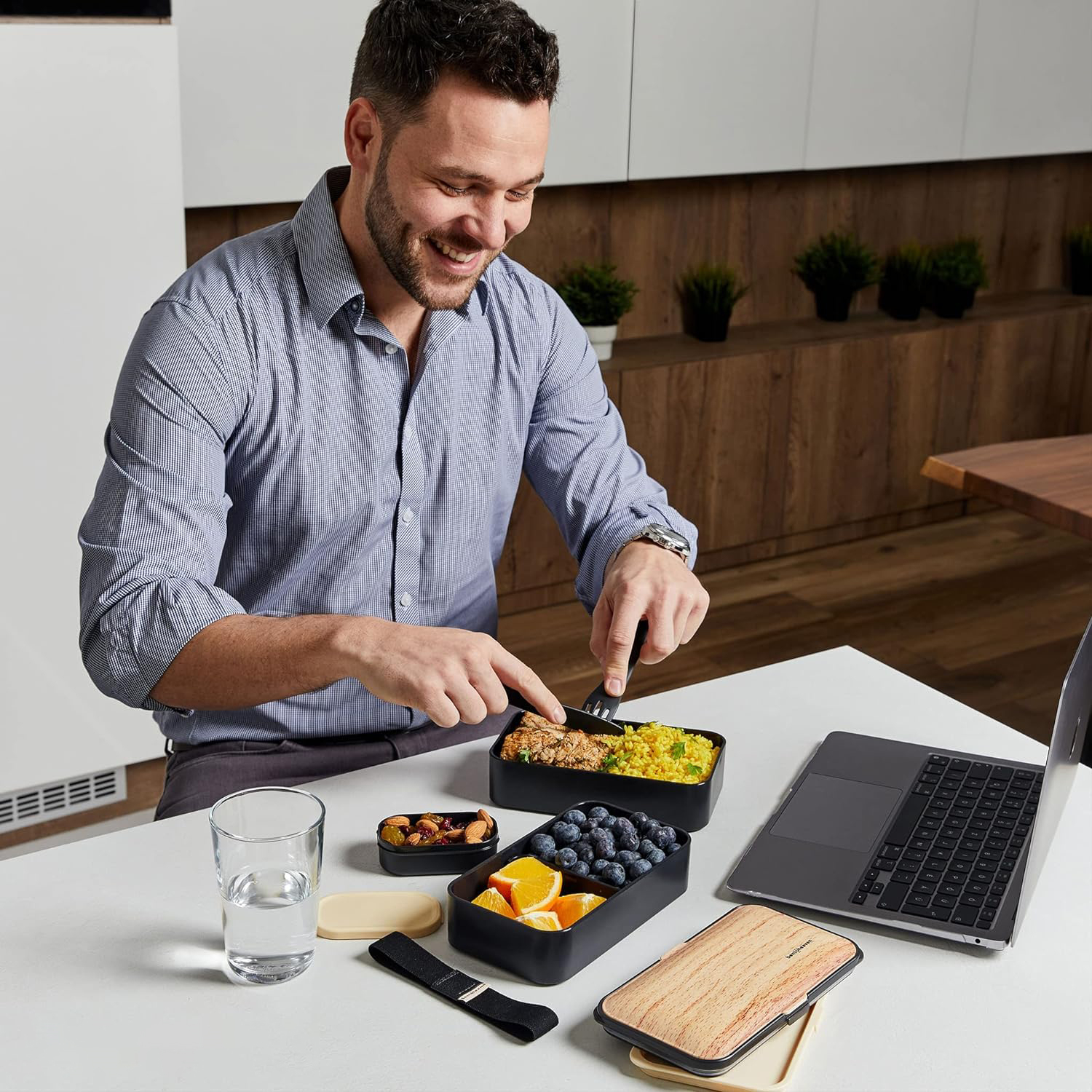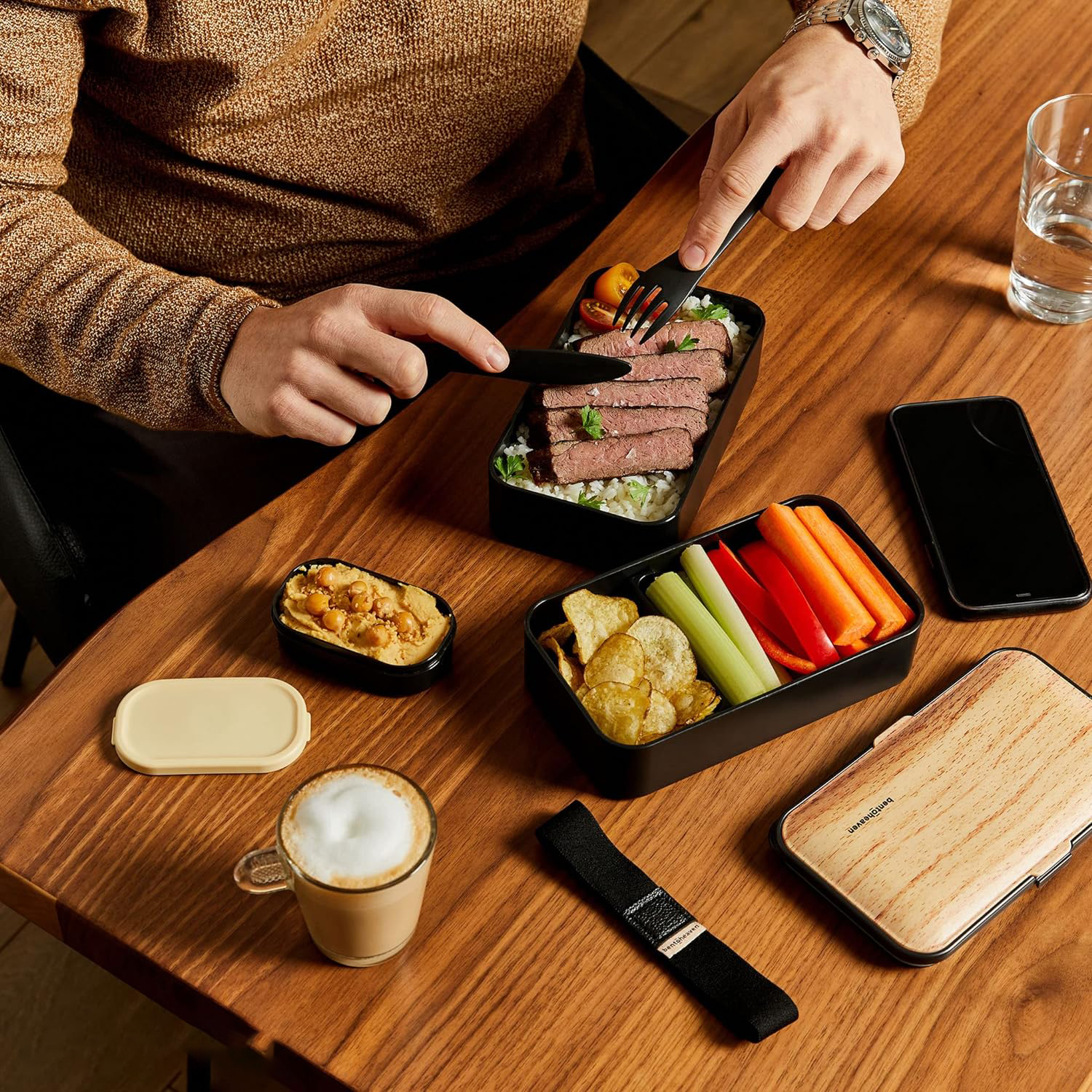 这款午餐盒套装轻巧紧凑,可轻松放入背包、手提袋或公文包中携带。其随附的餐具和蘸酱容器为外出用餐提供一体化解决方案,无论是在办公室、旅行期间还是户外活动期间。