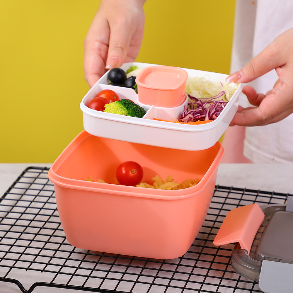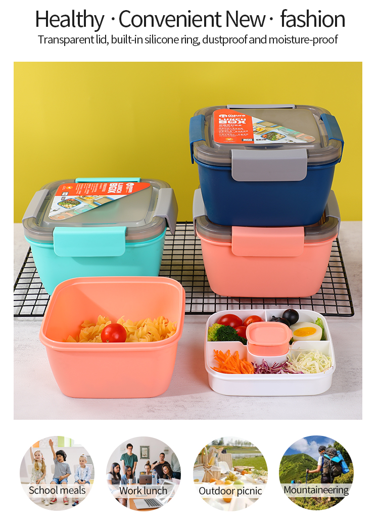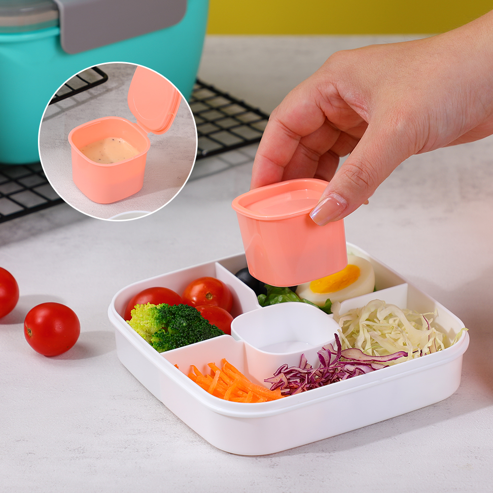 这款便当盒有四个隔层,可让您分开不同的食物,如三明治、沙拉、水果和坚果。可拆卸的酱汁容器方便携带蘸酱或调料,无需担心泄漏。凭借其防漏硅胶环和升级的锁定机制,确保旅行或日常使用期间安全可靠的食物存储。