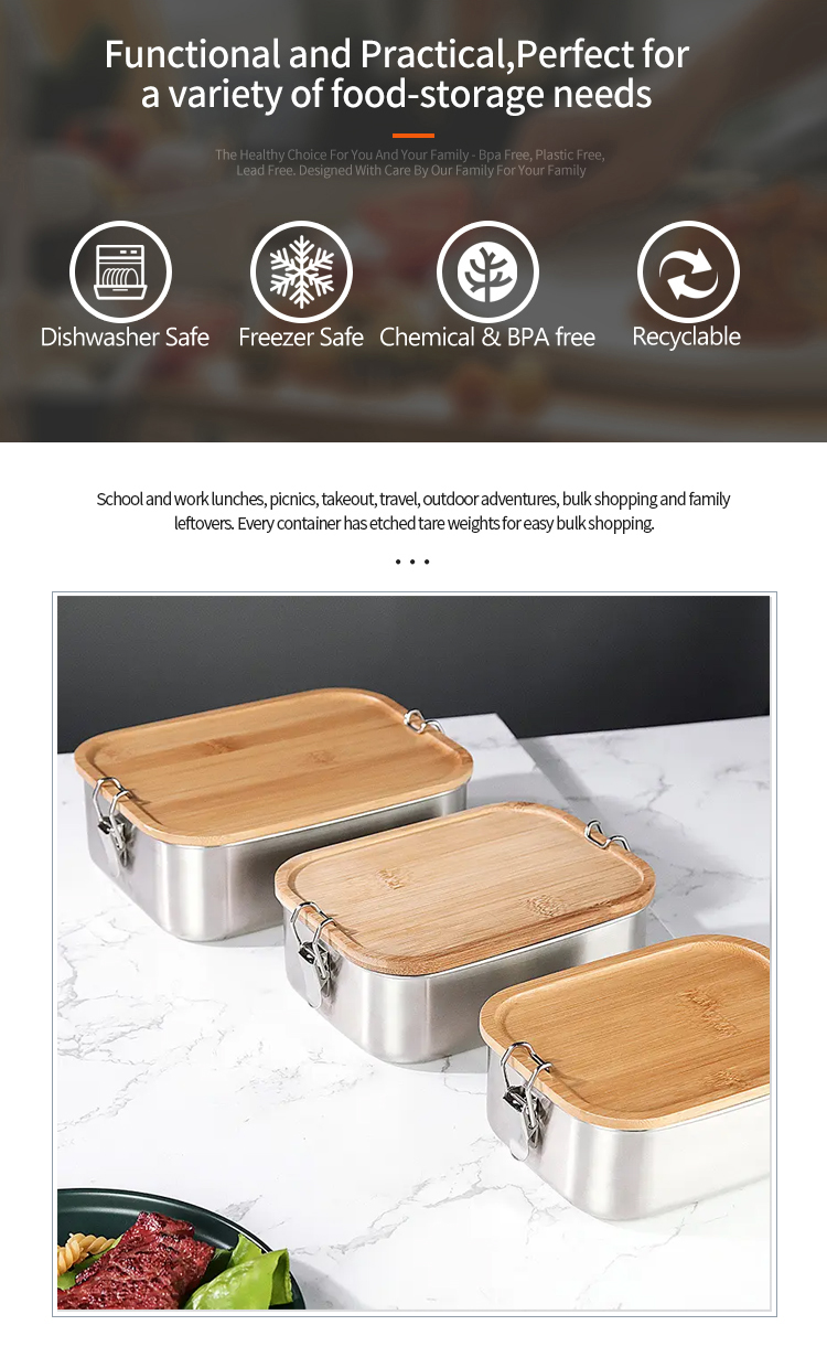 您的健康至关重要。该午餐盒由本质上可安全接触食品的材料制成。 304 不锈钢不发生反应,这意味着它不会与西红柿或柑橘类水果等酸性食物相互作用,确保您的膳食的味道和完整性保持不变。不含塑料消除了接触 BPA 和其他内分泌干扰物的风险。天然竹盖采用食品安全的植物油制成,对您和您的家人无毒且安全。每个组件的选择都以您的福祉为首要考虑。