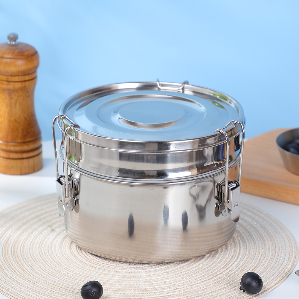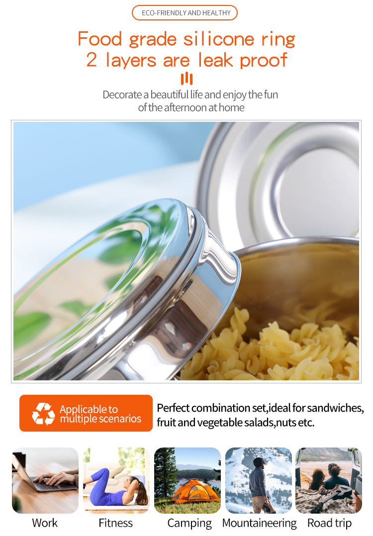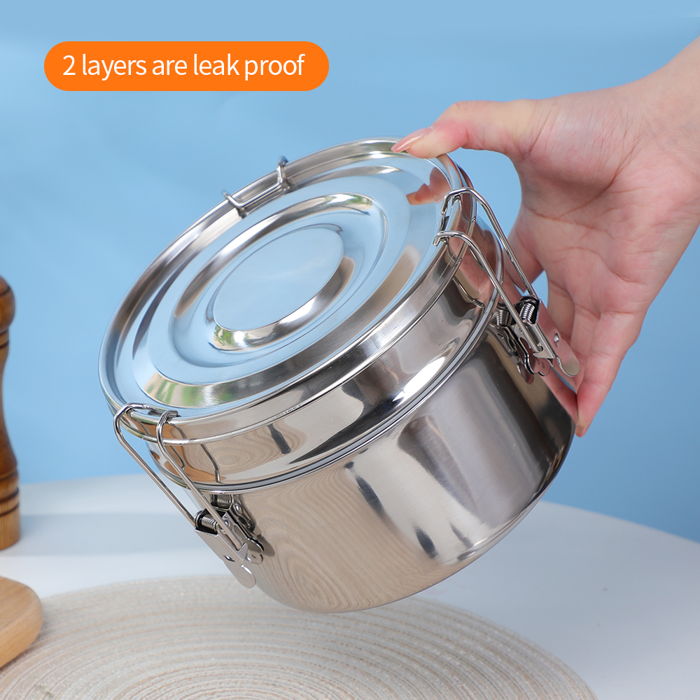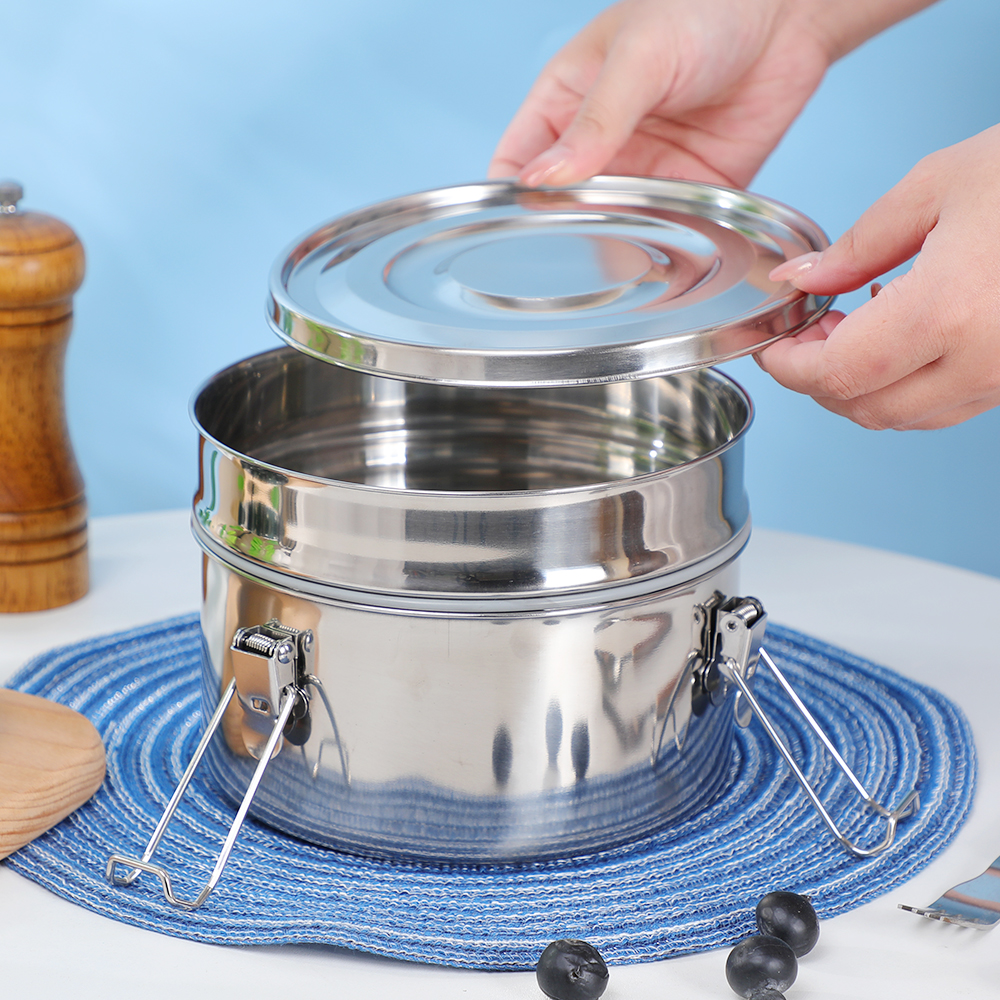 1) CE&FDA&LFGB 认证不锈钢便当盒保温午餐盒,最小起订量为 100 件。圆形 2 层大型可堆叠 便当盒 经过认证,可确保其中保存的食物不会释放有害物质和异味。